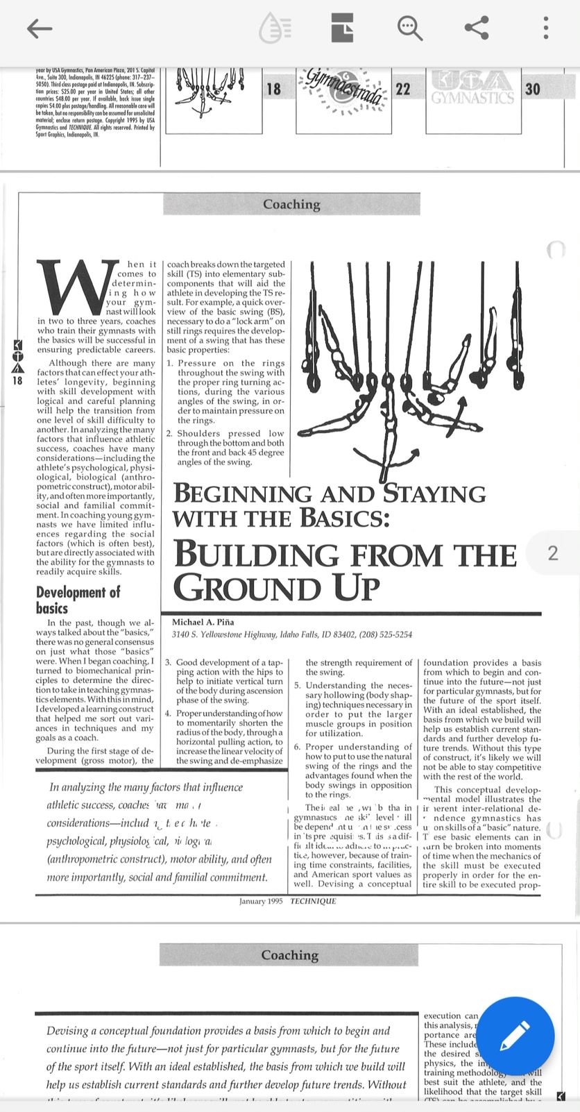 A key foundational reference is the article “Beginning and Staying with the Basics: Building from the Ground Up”, written by Michael A. Piña for a Technique gymnastics publication. This work emphasized breaking skills into elementary components governed by mechanical laws rather than coaching intuition alone. For historical context and transparency, the original reference image is available here: View the original reference image (opens in a new tab) .
